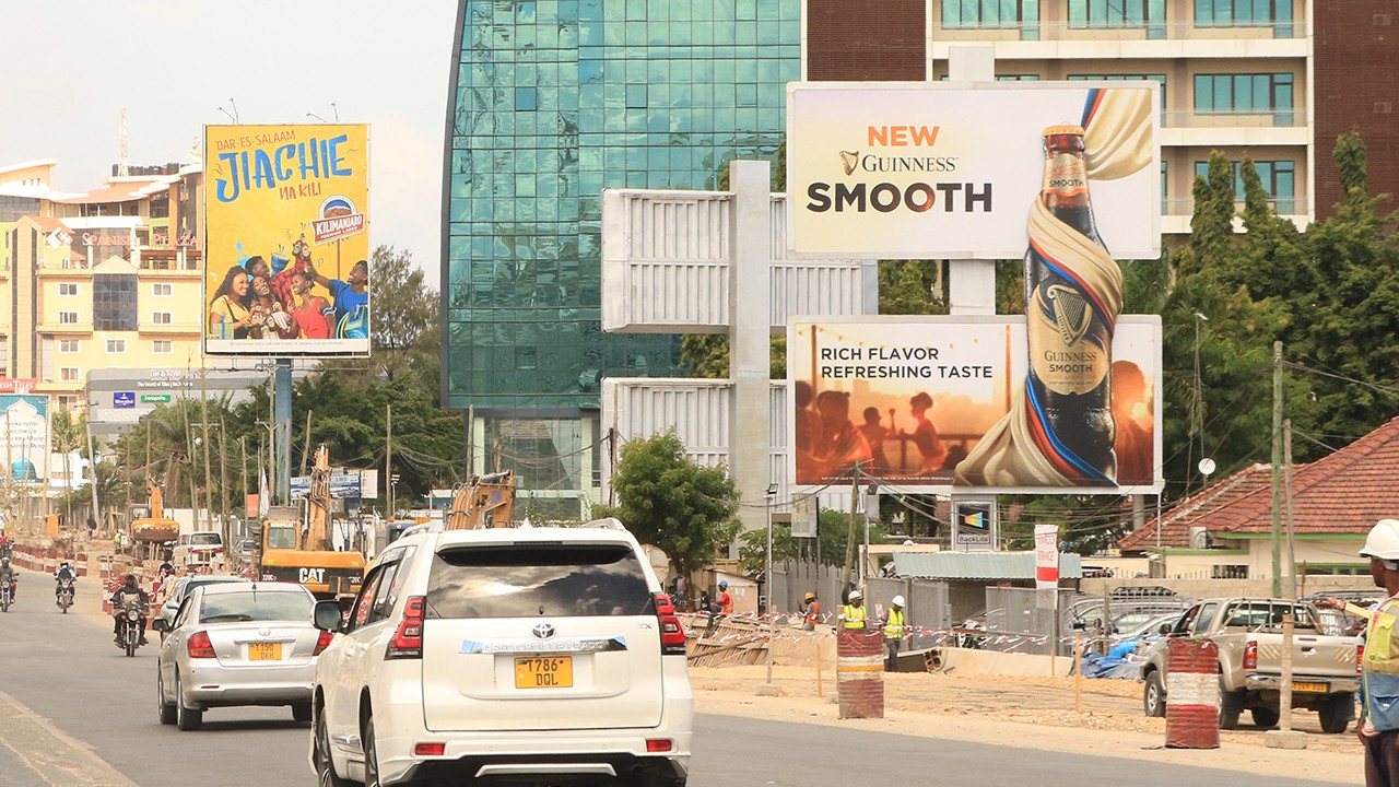 A landmark double-decker on Bagamoyo Road, capturing high-profile evening traffic in Tanzania’s Silicon Valley, near Vodacom HQ.